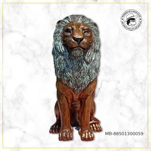 รูปปั้นสิงโตนั่ง ผลิตจากวัสดุทองเหลือง ทำสีรมดำ น้ำตาล, สีรมดำ เขียว ใช้สำหรับประดับประตูหน้าบ้าน